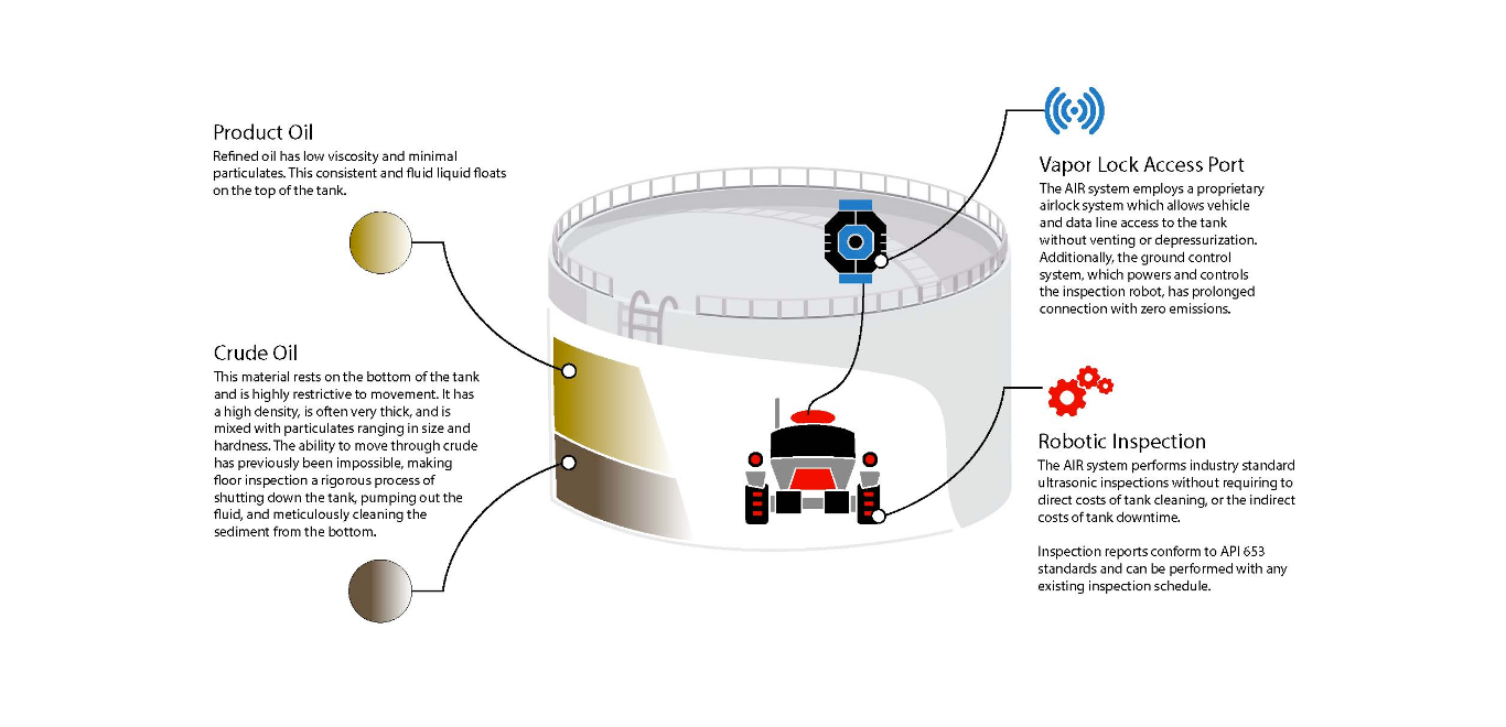 Applied Impact Robotics is developing a robotic solution capable of inspecting a crude oil tank floor while the tank remains in-service. By starting with a clean slate and using biomimicry our solution is unique in its ability to reduce viscosity of the sludge in a localized way. We leverage this reduced viscosity for penetration and maneuvering directly through the sludge and sediment to position sensors for floor scanning. By utilizing conventional UT sensors which are accepted as part of the API653 standard we can seamlessly integrate into your environment and provide high quality scan. By keeping the tank in-service during the scan, we significantly reduce the number of man hours required for confined space entry.